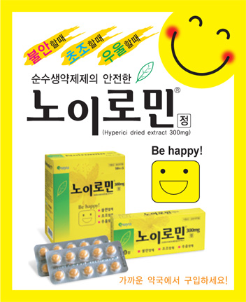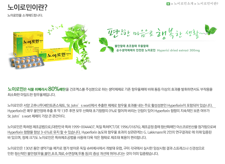 노이로민의 생약성분은 '세인트 존스워트'와 같습니다. 세인트존스워트에서 추출한 제제로 항우울효과를 내는 주요 활성분인 Hyperforin 이 포함되어있습니다. / 히페리시 80% 메탄올 건조엑스가 주성분