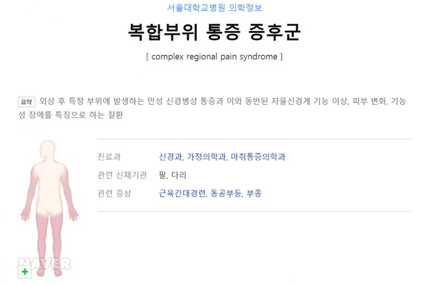 CRPS 병 RSD, 반사교감신경이상증이라도 하지만 최근에는 CRPS, 복합부위 통증 증후군으로 부른다. 주로 팔, 다리에 생기고 심하면 온몸에 극심한 통증과 부종(붓기)을 수반하는 질병으로 희귀병 중 하나이며, 국내 환자만 5,000명 ~ 20,000명에 이를 것[1]으로 추정된다. 중추신경계와 자율신경계의 문제로 인해 뇌로 통증 신호가 끊임없이 전달되어 생긴 것으로 추정된다. 아직 정확한 발병요인과 치료법은 알려지지 않았다. 크게 1형과 2형으로 나뉘는데, 1형은 특별한 신경 손상이 없이 발생하며, 2형은 신경 손상이 관측되는 경우로서 두 가지 형태의 원인은 거의 비슷한 것으로 보인다. 1형의 경우 외상 후 신경장애로 발병하여 1형으로 판정받는 경우가 가장 많다. 공통적으로 발병 부위에 심한 작열감(타는 듯한 느낌), 칼로 찌르는 듯한 느낌, 전기에 감전되는 듯한 느낌 등을 호소한다. 또한 그것을 자주 견딜 수 없을 정도의 고통을 유발한다. 그리고 많은 경우에서 발병 부위의 피부가 두꺼워진다거나 뼈가 굵어진다거나 부종 등이 생기곤 한다. 그리고 병의 진행 상태에 따라 근육 조직의 퇴화나 심한 근육통, 극심한 통증으로 다리에 힘이 들어가는데 문제가 와서 지팡이나 심한 경우에는 전동휠체어에 몸을 의지해야 하는 경우도 꽤 있다. 심지어 통증부위를 절단하는 경우도 있다.
